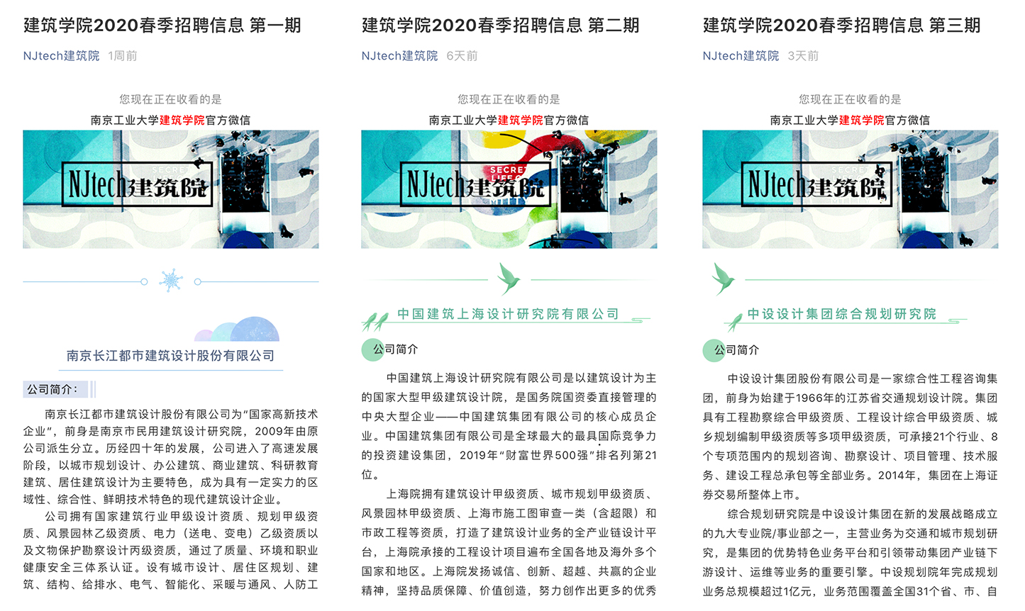建立“一行十企”,主动联系公司就业创业实习实践基地,和南京长江都市建筑设计股份有限公司、南京市建筑设计研究院有限责任公司、启迪设计集团股份有限公司等企业取得联系,主动了解其招聘需求,将招聘信息和用人需求第一时间发布告知员工,积极引导毕业生去挂牌单位就业。此外,和用人单位做好沟通,认真整理招聘信息,整理好之后发布到公司微信公众号上进行推送,并在毕业班群里发布,方便同学们选择。