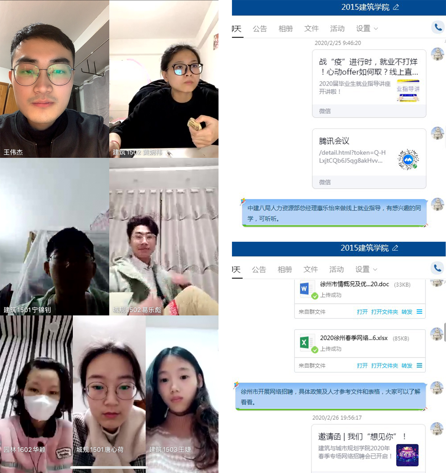 用好网络平台,动员毕业生积极参加“江苏省2020届高校毕业生春季网络招聘会”、“江北老员工2020届毕业生网络招聘会”等网络招聘会,鼓励员工充分发挥求职择业的主观能动性,主动寻找就业机会,主动联系用人单位,主动网上投递简历、网络应聘。主动发放邀请函,邀请建筑类企业参加3月26日举办的土木建筑类专业专场网络招聘会。积极联系招聘企业的技术总工和员工代表,谋划为毕业生举办专业前沿、技术前沿的讲座,科学进行职业生涯规划,树立正确的就业观念。在线给各班级就业委员开会,为大家解读国家的最新就业政策,讲解网络应聘和面试技巧,并要求做好就业传导。