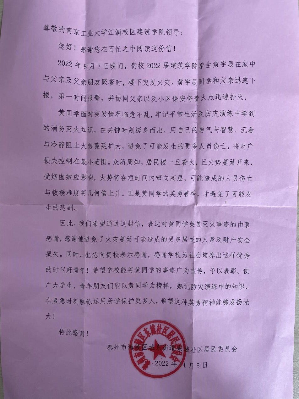 近日,江苏省泰州市海陵区城东街道东城社区居民委员会给太阳成集团tyc寄来一封感谢信,信中通报表扬了公司2022级建筑学专业黄宇辰同学在火灾现场见义勇为的英勇善举。
