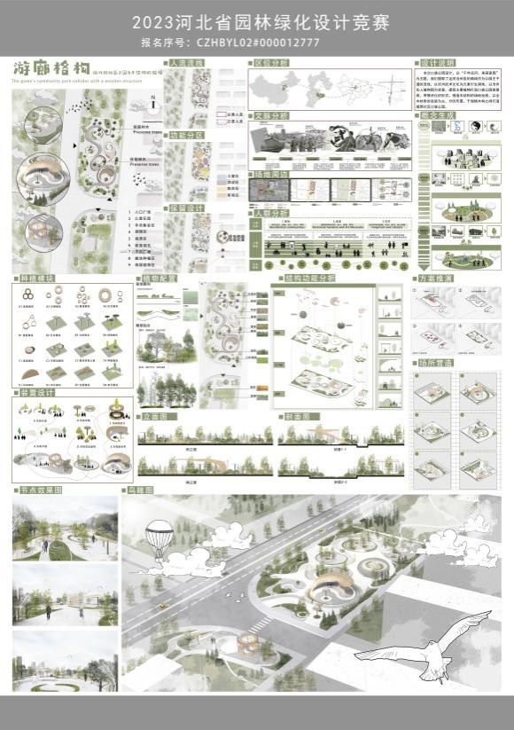 近日,由河北省住房和城乡建设厅、沧州市人民政府主办的2023年河北省园林绿化设计竞赛圆满结束。竞赛主题为千年运河·美丽家园。竞赛依托“园冶杯”国际竞赛平台,面向全球优秀设计师、设计单位及相关专业院校师生,广泛征集富有创意的方案,吸引了国内外100多所高校、设计院、园林公司、植物园等单位参赛,共提交了228组作品。在此次竞赛评奖活动中,公司研究生提交的两组作品获优秀奖,分别是姚望、吕铭洁、康孟琪组的《系住“你”——运河时光缎带主题公园设计》(指导教师:胡振宇教授、张海燕副教授)(图1)和王菡纭、姚姗、倪赛博、王佳文组的《游廊格构》(指导教师:张海燕副教授、胡振宇教授)(图2),特此祝贺!