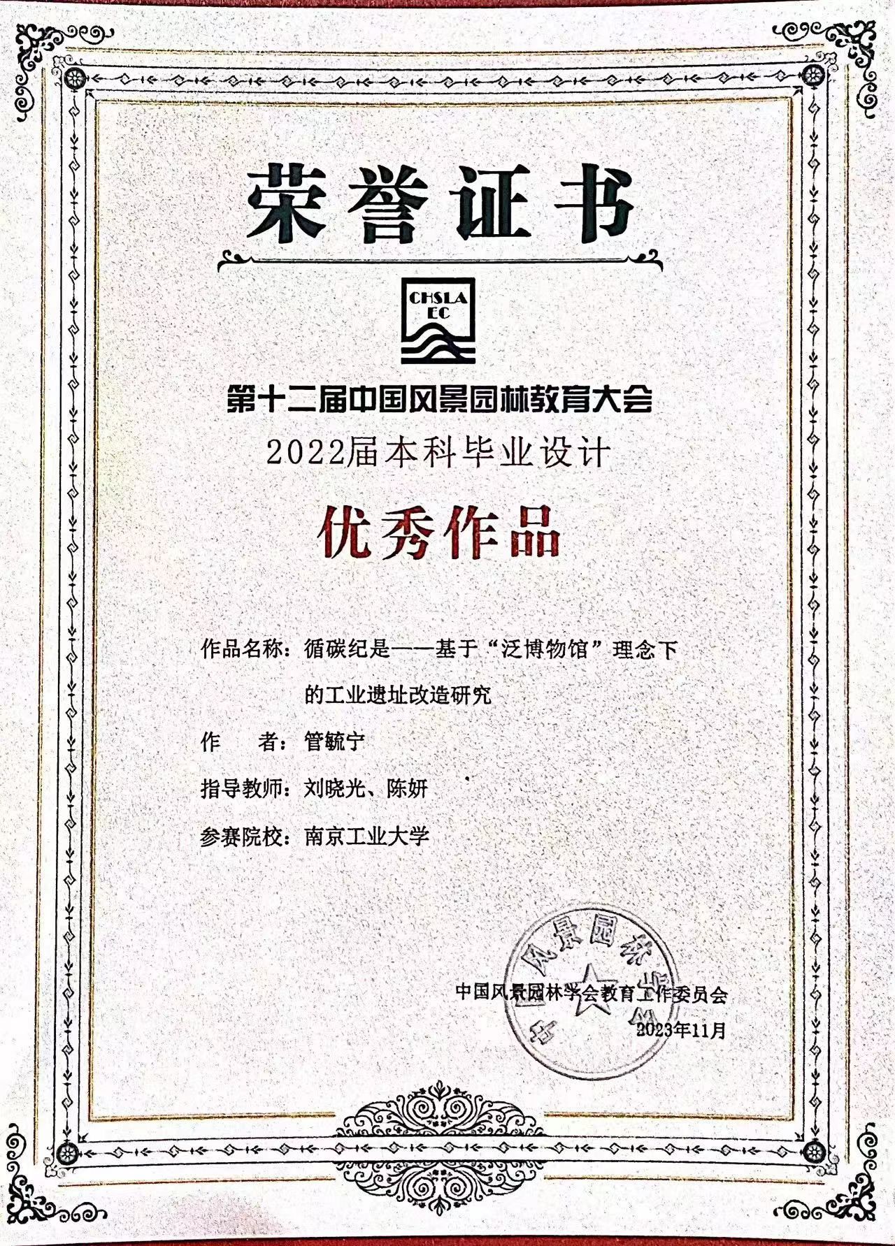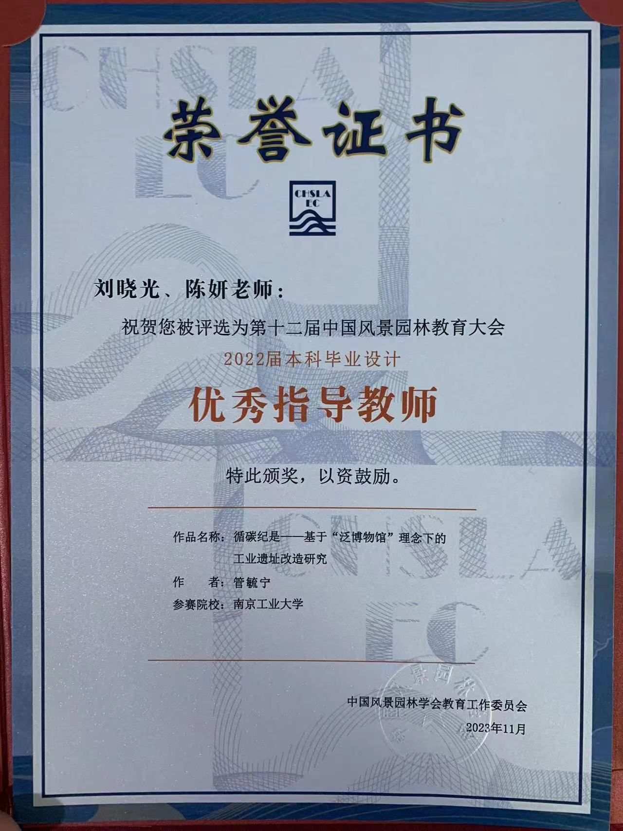 在同期举办的全国优秀本科毕业设计评选,共评选出30份优秀毕设作品。公司太阳成集团tyc风景园林专业2022届毕业生管毓宁、吴蕴涵、黄君祎的毕业设计《循碳纪是:基于“泛博物馆”理念下的工业遗址改造研究》,在刘晓光、陈妍老师两位老师的悉心指导下,经过激烈的角逐,顺利通过初评与专家终评,喜获此项荣誉,两位老师荣获“优秀指导教师”称号。