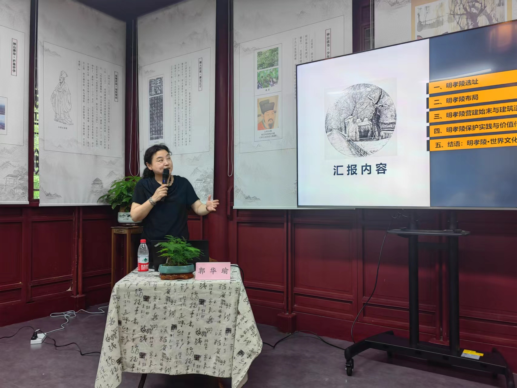随后,郭华瑜教授作“世界文化遗产-南京明孝陵营建与保护”文化讲座,全体领导嘉宾、志愿者、师生代表聆听了讲座,与郭教授进行了积极的互动交流。郭教授秉持“让文物活起来”的理念,阐述了建筑学科为明孝陵获批世界文化遗产与后续保护提供的助力与护航。明孝陵方城明楼、四方城加顶保护工程等一批代表性科研项目在学界和社会产生了广泛的影响,为文化遗产保护事业贡献了南工大的智慧与力量。