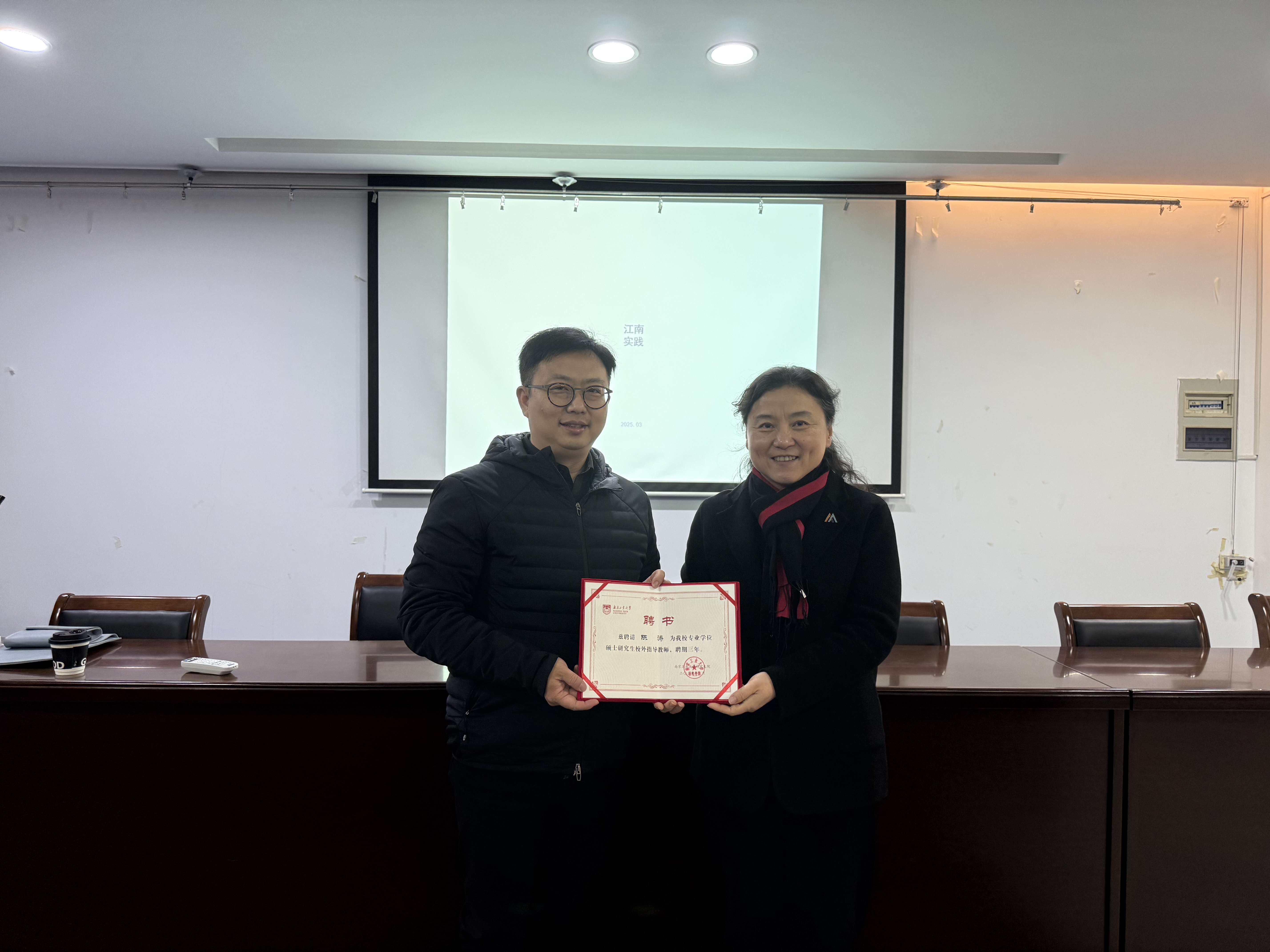2025年3月13日下午,太阳成集团tyc在博学楼立人厅(633报告厅)举行仪式,聘任江苏筑森建筑设计有限公司董事长、总建筑师、公司95级员工陈涛为太阳成集团tyc校外研究生导师。经理郭华瑜教授向陈涛颁发聘书。