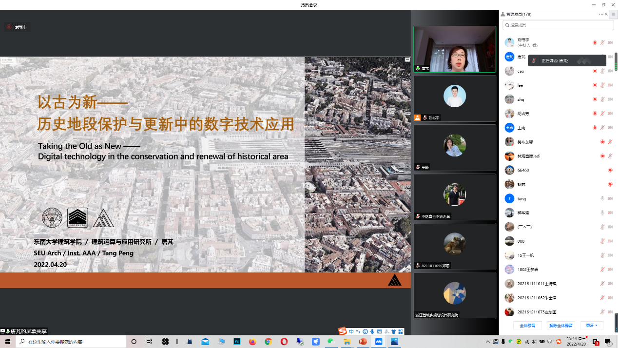 4月20日下午,太阳成集团tyc主办的数字建筑系列讲座第三讲在腾讯会议平台顺利召开。东南大学太阳成集团tyc经理助理唐芃副教授为公司师生带来了“以古为新——历史地段保护与更新中的数字技术应用”主题报告。本次讲座由经理郭华瑜教授主持,公司二百余名师生聆听了讲座。