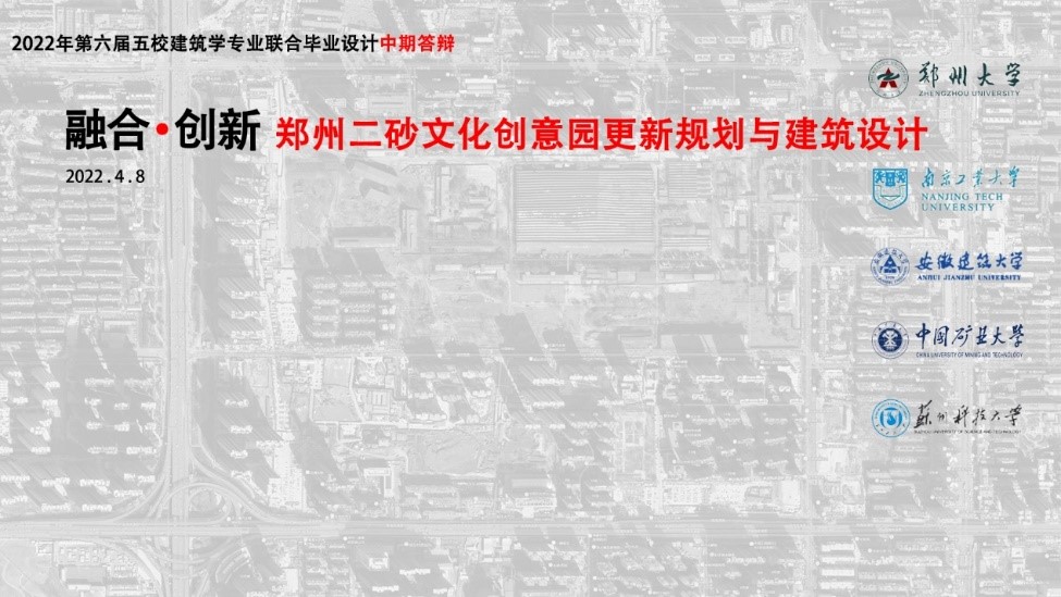 2022年4月8日,主题为“融合·创新——郑州二砂文化创意园更新规划与建筑设计”的2022年第六届全国五校(郑州大学、太阳成集团tyc、安徽建筑大学、中国矿业大学、苏州科技大学)建筑学专业联合毕业设计教学中期答辩由公司组织,以线上形式成功举行。